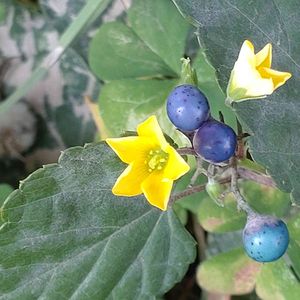 9/24の台風🌀で泥水に浸かったノブトウ。 葉っぱは、まだ泥が付いていますが、実は、キレイに色づいてます。🟣🔵 蔓の間からカタバミ💕 が顔を出してます😊