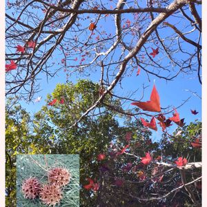 青空に赤い小鳥が飛んでいるような… 🍁モミジバフウ(紅葉葉楓) ウニのような実も落ちてます😊 フウ科 フウ属 燃えるような真っ赤な紅葉🍁も素敵です。 🏷8日は葉っぱの発表会に初参加させて下さいね🙇