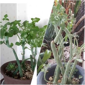 好き勝手に伸びてタケノコのように増殖する七宝珠。水を切って暑さに耐えてるだけかと思っていたら,今頃新芽が出てきた。新芽は色といい丸い形といい赤ちゃんの感じ。 蓄えてる水分で成長しているんだろうけど,成長する時期としては不思議。