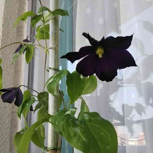 こんにちは😄 今日は、変な天気です☂️ クレマチスのロマンチカが咲きました😄 黒い近い濃い紫で、ビロードみたいな感じの花びらです。 ダフネさんとコラボしました😄 新枝咲き 強剪定