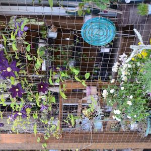 ウッドデッキの鳥獣ネットに這わしたクレマチス ロマンチカが咲いてます。