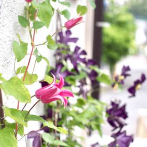 先月 みどりのまとめでもちらっと書いたが 半日陰の外壁で実験中のクレマチスたち 2年目のロマンティカと 3年目のダイアナも咲き出した 将来的には 部屋から窓越しに花が見えるといいなと思いながら 我が家のクレマチスの中で 樹勢の強い二つをを連れてきた ダイアナはここに移動した際に根もとから一本折ってしまい その枝が枯れてショックだけど なんとかコラボに間に合いそう^ ^;