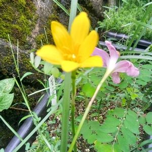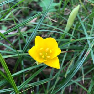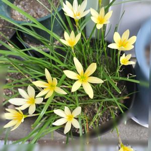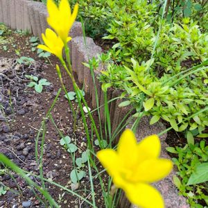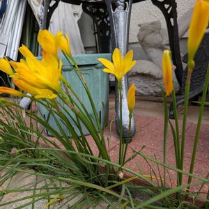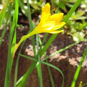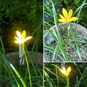 ゼフィランサス シトリナ 別名:キバナサフランモドキ レインリリー ゼフィランサスの黄色の品種 爽やかな檸檬色 歩道の脇に咲いています。 鉢植えのお家もありました。