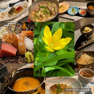 ☘️ゼフィランサス[シトリナ]☘️.....雨上がりに咲くこの黄色が1番好き🌼💕✨別名レインリリー。神戸から淡路島に渡り、初めての徳島市に行きました。山のてっぺんだから、遠くの海を眼下に眺めながらの[エクシブ鳴門]。1日目の創作和食[初海はつみ]は器も風流で、お刺身は勿論、左下の[南京のすり流し]は温かく、おいしいお味でした👍😋💕✨✨