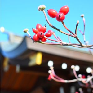 神社のハナミズキの実、真っ赤でツヤツヤして可愛いです🍒 ビーズにテグスを通し、ギュッと引っ張ってできたお花みたい🌼😃 真っ青な空に映えてました🌞✨