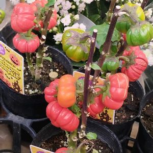 ホームセンターで見かけたパンプキンツリー 紫の観賞用トウガラシ、ケイトウと一緒にハロウィンっぽく寄せ植え🎃 トウガラシはよく見たらサトウ園芸さんのでした✌🏻