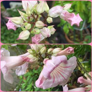 ❇️❇️❇️❇️❇️❇️❇️❇️❇️❇️❇️ 【ピンクノウゼンカズラ】🌼 📕ポドラネア属のピンク色の花を咲かせる品種です🌼 ◇属が異なる南アフリカ原産の品種で、寒さに弱いため冬には優しくしてあげて下さいね。 📕☆名前の由来☆ ◇和名は、漢名の「凌霄(りょうしょう)」という名前が「ノウセウ」となまり、その後ノウゼンになったと言われています〜😀 ◇英名は、ラッパに似た花の形から「トランペットヴァイン(Trumpet vine)」や「トランペットクリーパー(Trumpet creeper)」と呼ばれます。