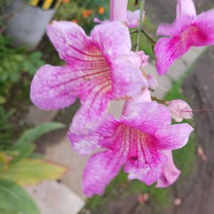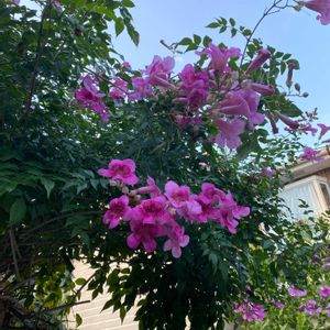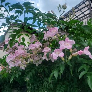《ピンクノウゼンカズラ》 花は枝の先に付く円錐花序で、花冠は長さ7~8cmの鐘形(ツリガネガタ)🌸 花色は淡い桃色で赤紫色の脈が入ります🤭 南アフリカを原産とするノウゼンカズラ科ポドラネア属の常緑つる性低木です🌸🌼