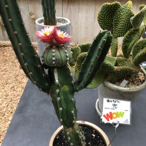 去年接木した福禄寿×兜丸。ほんとは龍神木とかが台木にはいいんだろうけど、同じ柱サボテンと思いやってみました。接木としてはなんか浮いて失敗かと思いきや、なぜか横からカキコが、、 なんか不思議です。