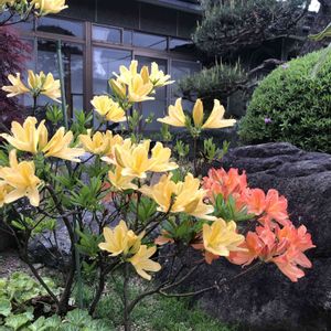 ①今日のお花シャガ💙🤍 ②フタバアオイ🍀 この紋所が目に入らんか〜 はは〜🙇 ③ラショウモンカズラ まだあった〜😍💙😍 ④ホウチャクソウ 🏮みたい💟と紫の実💜も好き😆 ⑤レンゲツツジ キレイなオレンジ色が目立ちます💛💛