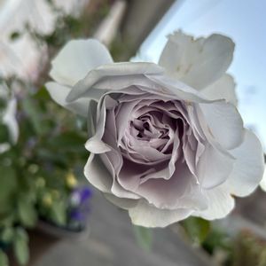 ポルトブルー 春先や晩秋、直射日光が当たらないときに青味を感じる色に咲き、直射日光に当たるとグレー味を感じる 花名はフランス語で青い扉 初花は、つぼみの外側は薄っすらグリーンを帯び、花は薄いグレーに中心部が薄い藤色 ブルーグラビティより耐病性と樹勢は強そうです 季節と陽のあたり方によりブルーに近くなるようなので、置き場所を半日陰にしてみたいと思います