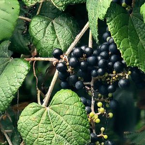 エビヅル ブドウ科ブドウ属のつる性の落葉木本 ・ブドウの仲間です ・雌雄異株 ・葉の反対側に出る巻きヒゲで樹木 などに絡みついています ・まだ緑色の実③もありますが、巨 峰のように熟した実も沢山ありま した①② でも大きさは6〜7㍉と、とても 小さいです ・葉っぱも可愛い☘️ 先が3つに分かれてるものや5つ に分かれてるものもあり、 ・⑤そして葉裏がpoint☝️ 葉の裏には、茶色の綿毛がたくさ ん生えています 今年は丁度良い頃にやってきたようです。熟した色の実をお口に入れれば、やはり甘くて美味しい😋 🤳2025/10/13