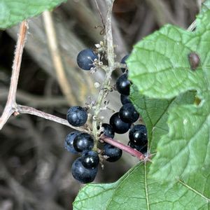 エビヅル(海老蔓)ブドウ科ブドウ属 エビツルの果実、はじめまして。 綺麗な色、思ったより大きな実でした。 9月7日 葉っぱも可愛いんです。 和名の由来は若葉の裏面に白色~淡紅褐色の毛が密生し、エビの色に似ていることから。 葉は長さ、幅5~15㎝、3~5裂し、有柄。葉裏には白色~淡褐色のクモ毛が密生する。 巻きひげは葉と対生する。 雌雄異株。円錐花序に多数の花がつく。 雌花(両性花)、雄花とも黄緑色。 果実は直径5~6㎜、黒く熟すと、甘酸っぱく食べられる。 🏷 水曜日は水色 🏷 8日は葉っぱの発表会
