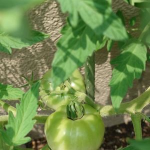 6/19 定点観察 大玉🍅ボンリッシュ こちらにも、スーパー原液🚿 ミニトマトとは違い、まだ大玉トマトは青いままです ここはお花💐と🍅の混植花壇にしていて 2週間、あまり変わり映えしないので肥料切れなのかもと思い、こちらにもスーパー原液を散布🚿