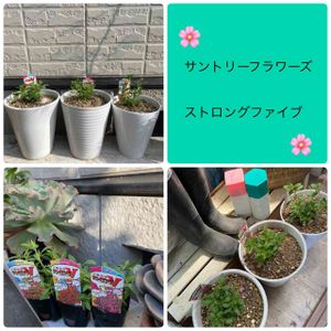モニターでいただいた、ストロングファイブようやく植え付けの時間ができました🪺 他社ですが、🌸ちゃん培養土で植えつけてます。SFって意外に用土は売ってない気が…。 ちなみに下段はカインズの、あふれ咲きカリブラコアの同色系を植えました。 しばらく天気が良さそうなので、明るい日陰で1週間ほど様子を見る予定です。
