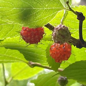 コロナ禍で控えていた田園風景の広がる日帰り温泉♨に友達と久しぶりに訪れた。 帰りがけ駐車場で赤い実を見つけた。 木苺かしら⁉と思いながら一粒摘んでみた。 ほんのり甘くプチプチとした感触。 🔍するとヒメコウゾと出てきた。