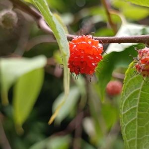 ヒメコウゾ 裏庭は林の縁なので、ご多分にもれず勝手に生えているのだけれど、ウニのようだった雌花が結実して、下から順に色づいてきた🟥 赤くなっても長い花柱が残ってピョンピョンと顔を出しているので 食べる気にはならない 真っ赤な火曜日🏷️