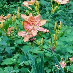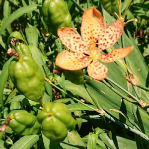 山野草 【ヒオオギ】 檜扇 アヤメ科 ①あざやかな彩色を 優雅に装う 一日花 印象的な魔除けの花という ②万葉人の愛でた 艶々、麗し 漆黒の実 「ぬばたま」(射干玉)に 魅せられて…。