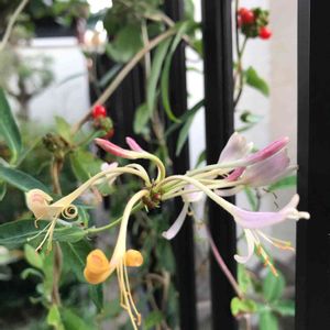 🎆 ハニーサックルの花 🎆 春に比べると小さな花となりましたが、まだチラホラ咲いています。花後は真っ赤な赤い実が出来ています。蔓性の低木なので、フェンスに絡ませています。