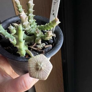 黒くなって横に倒れていたのでもうダメかと思っていたのですが、、ピーンとなって新芽🌱出てました。 変わった花が咲くはずです。 楽しみ❣️🌼