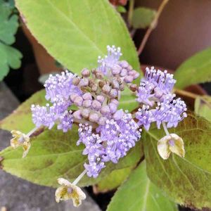 タマアジサイが咲きました。淡い黄色の装飾花、紫色の両性花が気に入ってます。 半日陰で育てていますが、しかし、今年も猛暑で葉や花の一部が焼けてしまいました😂