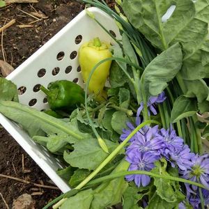 今朝の収穫です。 ミニトマトはこれからの収穫が見込めないので苗を倒し、青い実はピクルスに。 ニラのツボミ、スティックブロッコリーとピーマンは野菜炒め。 カラーピーマンはオリーブオイルで焼いて。 チコリの花はサラダに。