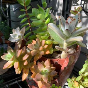 夕暮れ時の グラプトペタルム・ラベンダーフォームさん😻💕 朧月さんの斑入りさんです😺 其々違うお色の紅葉が 楽しい😽🎶
