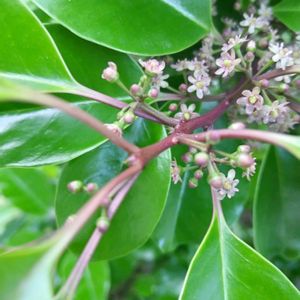 クロガネモチ 開花始まる モチノキ科 25年目になります。 熊本 千葉 新潟 と転々としましたが それぞれの地で逞しく育って たくさんの花を着け 秋には赤い実で豪華な衣装を纏います。 小さな蜂が ブすくンブン翔びかっています🍀