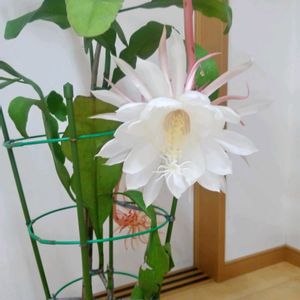 月下美人 先に投稿したツボミ2個が予想通りの 昨晩 咲き出し、鑑賞のため 室内に移動しました。 19:30頃 ツボミの先端が開き始め、香りが部屋中に満ち満ちてきました。 満開を見たかったのですがが、睡魔に襲われて,,,