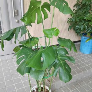 モンステラ サトイモ科 モンステラ属 玄関内にて 冬越しをしました🍀 2月の上旬に最低室温が 7℃まで下がりました。 まだ 新芽は出て来ません。 気根が数本出ています。 2022年植え替えたので、今年を予定しています🍀