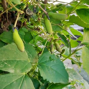 アケビ (幼果) ひと月前にたくさんの花が咲きました🍀。 授粉樹の鉢植えも傍に置いたので、生りすぎるのかなと思っていましたが、この通り疎らにしか着果してません。 秋が楽しみです。