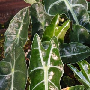 先程投稿した アロカシア'エレーン' のアップ画像です🌿 シルバーリーフと 葉脈がとっても美しいですよね🕊 インテリアグリーンとして お部屋をおしゃれに装飾してくれます✨ 比較的育てやすいので ぜひ探してみてください🌱