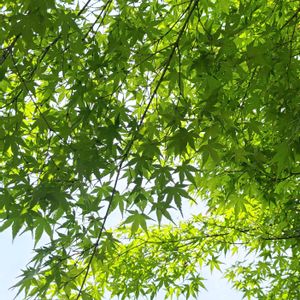 モミジ イロハモミジ ユカリさんの 🏷️目に青葉〜2025 モミジの応援投稿 仰ぎ見る青モミジの美しさに気づいたのは歳を重ねてから。 広い庭があったら、モミジを植えたかったな。 イロハモミジ、翼果が上向きに付く。
