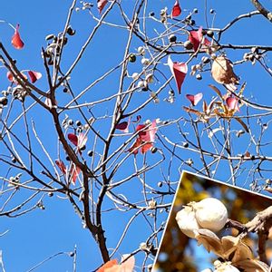 ナンキンハゼ 公園でかわいい白い実がなっていました 花友さんにナンキンハゼと教えてもらいました 黒っぽい実が弾けて白い種が出てくるそうです 少なくなった葉っぱもきれいに紅葉していたみたいで 来年は紅葉を見たいです
