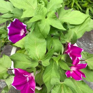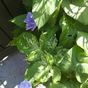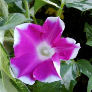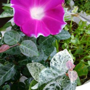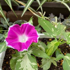 ツルなし朝顔咲きました 斑入りの葉っぱも可愛いです