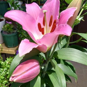 沖繩 伊江島で 1月末に球根で連れてきた オリエンタルリリー 昨晩の 吹っ飛びそうな強風から 守って 今日 開き始めた(#^.^#)♥ 凄く大きいです\(^o^)/ 3枚目 普通のサフィニアがやっぱり欲しくて植えました(^^)目指せ直径1メートル🤩