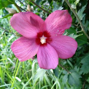 8月28日 今日のお花『ムクゲ』です。 【ムクゲ(木槿)】 中国原産、アオイ科低木 朝開いて夕方にはしぼむ一日花。生長する枝の葉腋に次々とつぼみをつけるため、花期は長く、梅雨明けから9月まで、次々と咲き続ける。 花色は白を中心にピンクや青紫などがあり、花の形は一重と半八重、八重がある。 樹高:1~2m、 開花期:7月~9月 花色:白,赤,ピンク,紫,複色 近所の空き地にて