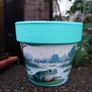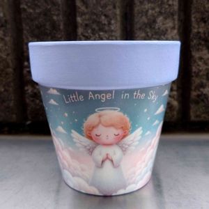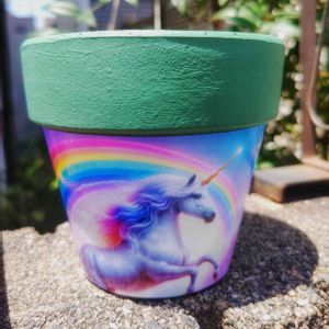 4歳になる孫がAIで作った画像 「虹のなかを走るユニコーン」 をリメ鉢にしてみました。 本人は ユニコーンのツノの先端が ピカッと光っているのが良いのだとか 笑