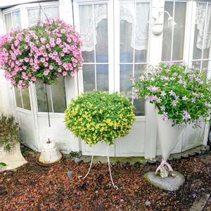 【PW シルキーピンク PW ビスタミニ サントリー サニープリンセス】 この3つとも 吊り下げ用 ハンギング無のですが 吊り下げるハンギングフックが 2つしか無いので フラワースタンドにて育成 どうにか置き場の確保てな感じですかね この他にもPW ラブラブラブもスワッグにて吊り下げハンギングしてるから 吊り下げる場所が無い… 来年はハンギングポールを作るべきと思いましたね