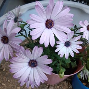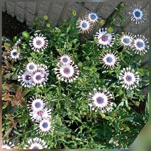 オステオスペルマムが満開♪ 昼間はパッカーンなので分からないけど、実はかわいい斑入り(2枚目)。 オステオは暑さに弱い植物らしい。 最近まで知らなかった。 夏に下葉が枯れ込んでみすぼらしくなるのは私の育て方が悪いとのだと思い、昨年かろうじて生き残っていたオステオを処分した。 なんだ。私のせいやないやん。 夏に弱いなら一年草扱いでもいいやん!とまた購入。 弱いとわかっていればどれを選んでもいいやと以前から気になっていた斑入りにした。 ところがですよ、この斑入りが可愛すぎる。 結局いつものように挿し芽してなんとか残そうとするのだという予感。 罪作りやわ。斑入りのオステオ。