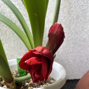 アマリリス 今朝ここまで咲き進みました ステキなお花です 我が家に来てから初めての開花 です、 大満足です、