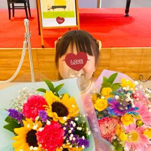 初めての花束 同い年のいとこが、発表会を見にきて花束を贈ってくれました! お互い大好きなのでずっと嬉しそうな長女でした…♡ イケメンないとこが花束をくれて肩まで抱いて写真を撮ってくれるって羨まけしからん…前世でどれだけ徳を積んだの…? 花やラッピング、リボンの色までいとこが選んだんですって…♡