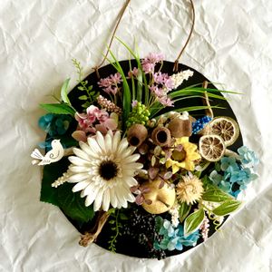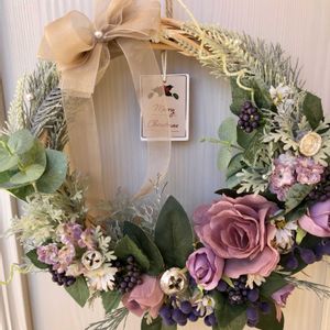 玄関ドア飾りを新しくしました 外でも耐えられるようにアーティフィシャルフラワーを中心にドライもまぜて✻*˸ꕤ*˸*⋆。 長持ちしてくれるといいな