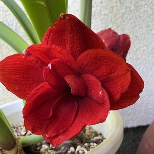 アマリリス 今朝のお花です 高く伸びたお花もここまで 開き出しました、 これの根元で大きなお花が 二つ咲いています