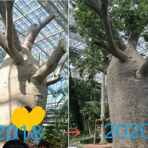 広島の植物公園のオーストラリアバオバブです🌳✨ 直径約2㍍で日本一の大きさらしいです❗ 広島にやって来た頃と比べて、葉が繁って馴染んでました😁できないですが、抱きつきたくなる幹です😙
