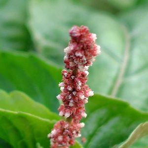 エノキグサ トウダイグサ科エノキグサ属 一年草 葉がエノキに似ているのでこの名が付いた。 別名はアミガサソウ 日本全国に分布 畑や道端に生える雑草 花期8〜10月 高さ30〜50cm 葉は互生し、鋭い鋸歯がある。 まず、雄花が穂状に付き、その基部に総苞に包まれた雌花が付いている。 花序は長さ1〜2cmである。 雄花の雄しべの色が淡紅色なので、花穂全体も赤っぽい色に見える。雄花は小さく、外に花被片があり、これには萼と花弁の区別がない。(①) 基部に編笠状の総苞に抱かれた雌花が付く。(②の下の方)