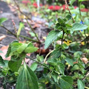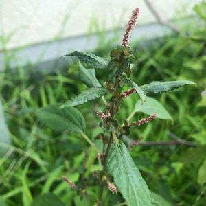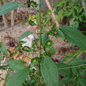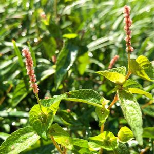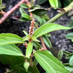 シソみたいな葉っぱの植物は多い 要するによくある形の葉っぱなのだ これはエノキグサ ざっくりいうと虫こぶみたいな雌花がついて突起みたいなピンクの雄花が咲く変な形の草