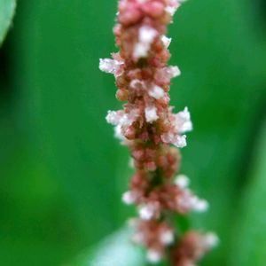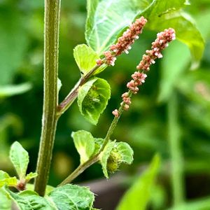榎草 エノキグサ トウダイグサ科 エノキグサ属 ピンク色で穂状についているのが雄花 ハート形の総苞に抱かれたようについているのが雌花 今まであちこちで出会ってたでしょうに気付かなかった花です