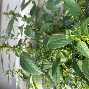 ※トウダイグサ科エノキグサ属 日本全土の畑や道端などに生える 高さ30〜50cm 葉は互生し長楕円形から広披針形で鈍い鋸歯あり 花期 8〜10月 花序の葉腋につき上部に小さな雄花が穂状につき、基部に編笠状の総苞に抱かれた雌花がつく 雄花は小さく8個の雄しべが膜質の花被に包まれ開花すると花被は4裂する(まだのようです) 雌花の花被は深く3裂し軟毛が多い 子房は球形で表面に小さい突起軟毛が密生し果期にも残る 花柱は3個で先端が糸状に裂けるそうです ここまで聞くと雌花を分解してみたくなりますが後日見るとタデ科の植物に埋もれて見当たりません 9月11日撮影