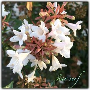 ✳️✳️✳️✳️✳️✳️✳️✳️✳️✳️✳️✳️ 「アヘリヤ」🌼*゚ 人気の園芸種で、公園マンション等の周りに植えて有りますね、開花時期も六月から十月位まで楽しめます、香りも良く寒さにも強い為、花のアイドル的存在ですね😃 アベリアは、19世紀中期にイタリアで作出された交配種です。両親の長所である四季咲きという良い所を受け継いだサラブレッドです。 ✳️✳️✳️✳️✳️✳️✳️✳️✳️✳️✳️✳️